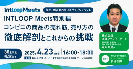 コンサルティング事業、フリーランスのエンジニアやコンサルタント向けプロジェクト案件紹介事業などを行うINTLOOP株式会社(イントループ、本社:東京都港区、代表取締役:林 博文、証券コード:9556、以下当社)は、2025年4月23日に、平良 良勝氏(株式会社沖縄ファミリーマート 専務取締役 社長補佐 商品・物流・品質管理本部長)をゲストにお招きし、INTLOOP Meets特別編と銘打ったオフラインイベントを開催いたします。