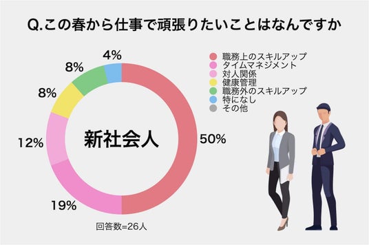 新社会人がこの春から仕事で頑張りたいこと1位は「職務上のスキルアップ」で半数が選択し、2位の「タイムマネジメント」19%から大きく差をつけました。