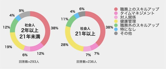「その他」には、社会人2年以上21年未満、21年以上ともに「外見をみがく」を選択した人が5%以上、副業が約4%いました。