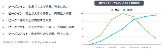弊社では商品の投入から完売までのプロセスのことを商品ライフサイクルと呼んでおり、成果を創出するためには、ライフサイクルに沿った適切なタイミングでの売価変更が重要です。