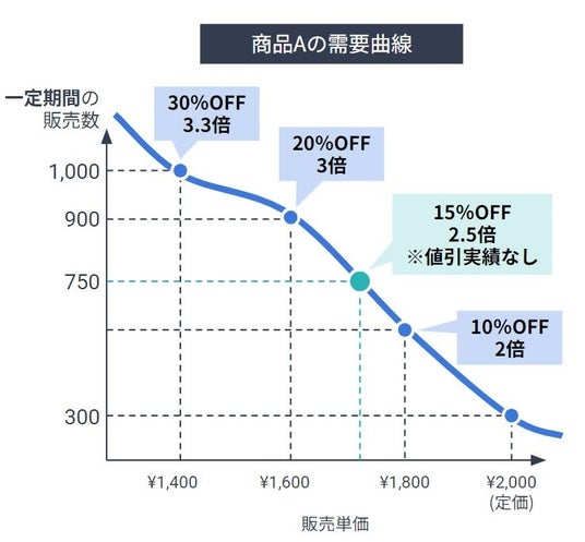 その場合、今までに実施したことがある30%、20%、10%のオフ率を加味して価格の弾力性を見ながら需要曲線を描き、理論上の伸長率を予測します。