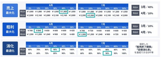FULL KAITEN〈売価変更〉では、どの商品をいつ何%オフにすれば、売上、粗利を最大化できるのか、最も消化が進むのかを自動計算することが可能です。