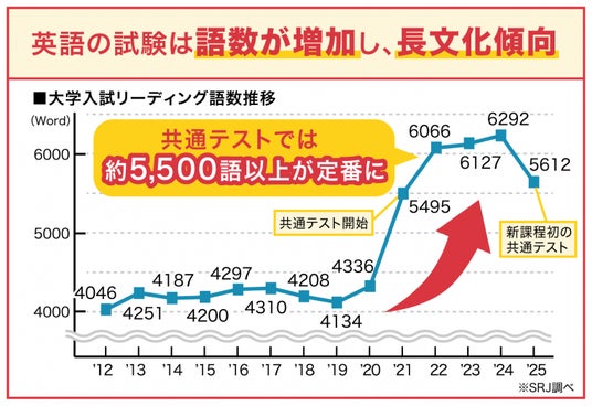 総出題語数は、共通テストが開始された2021年度以降、増加を続けていて、2024年度には約6,300語となりました。2025年度は約5,600語の出題で、これまで出題語数が多すぎて苦労していた受験生にとっては追い風になったことでしょう。