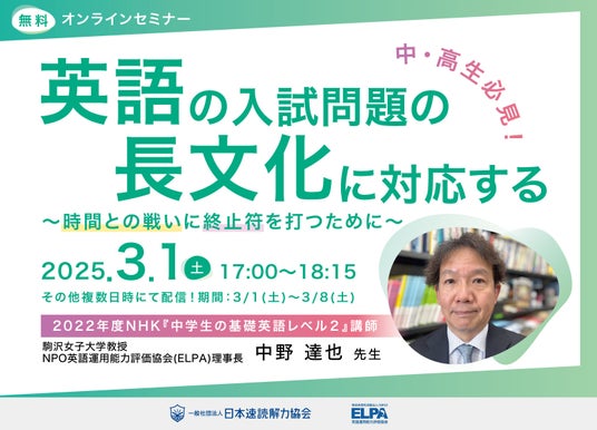 株式会社SRJ(所在地:東京都中央区、代表取締役:柏木理)が運営する一般社団法人日本速読解力協会は、3月1日に「英語の入試問題の長文化に対応する~時間との戦いに終止符を打つために~」をオンラインセミナーとして開催します。