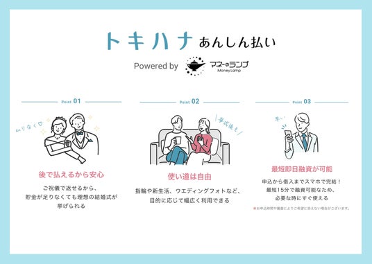 費用を理由に結婚式場選びに悩んだり結婚式を諦めたりするおふたりをサポート、結婚式の選択肢を広げる【トキハナあんしん払い】の提供をスタートします