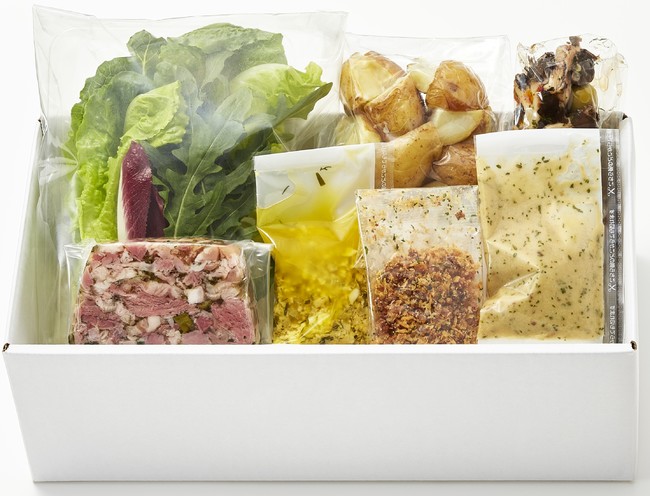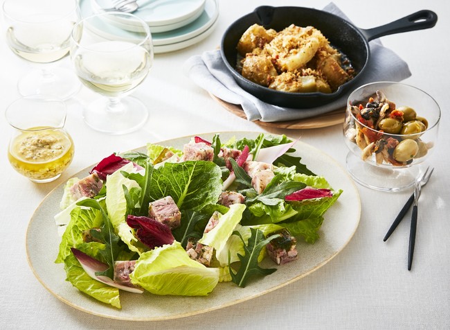 自社製のハムとパセリのパテ(ジャンボン・ペルシエ)に、アンチョビバターソースと相性の良いポテト、きのこ&オリーブのマリネをセットにしました。華やかなサラダとお酒も進むおつまみは、父の日の食卓にぴったり。