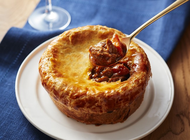 サクサクのパイ生地を崩しながら食べる、楽しい一品。丁寧に煮込んだ牛すじ肉とマッシュルームの旨み、食感を残した野菜、デミグラスソースが相性抜群です。