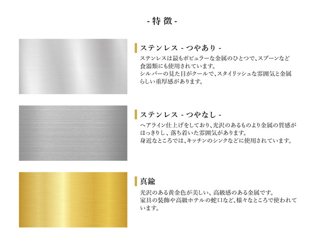 素材は「ステンレスつやあり・つやなし、真鍮」の3種類の中からお選びいただけます。