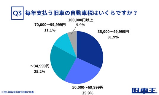 旧車オーナーの約6割が年間35,000円以上の自動車税を支払っており、特に「35,000~49,999円」が最も多く(31.9%)、次いで「50,000~69,999円」(25.9%)、「~34,999円」(25.2%)と続きました。さらに、「100,000円以上」と回答した方も5.9%存在し、旧車の維持にかかる税負担の大きさが浮き彫りとなりました。