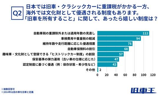 ・調査内容:Q1.自動車税(種別割)の納税額に不満はありますか? Q2.日本では旧車・クラシックカーに重課税がかかる一方、海外では文化財として優遇される制度もあります。「旧車を所有すること」に関して、あったら嬉しい制度は?(複数選択可) Q3.毎年支払う旧車の自動車税はいくらですか?
