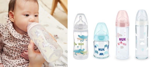 デザインのバリエーションが豊富な、軽くて扱いやすいプラスチック製のほ乳びん。くまのプーさん、ライオンキング、バンビのディズニーシリーズも展開しています。ミルクの飲み頃の適温がわかるメモリ付きです。