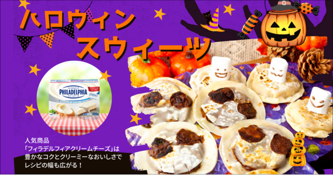 本授業では森永乳業の人気商品「フィラデルフィアクリームチーズ」を使用し、2種類の「パンプキンスイーツ」を作ります。出来たてで食べるとかぼちゃの優しい風味を味わえ、時間をおくとフィラデルフィアクリームチーズの濃厚なコクを味わえる、2度おいしいスイーツです。
