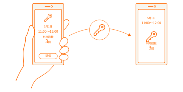 入居者はhomehubのスマートフォンアプリから、指定した日時や回数のデジタルキーを発行し、家族や友人などに簡単に送付が可能です。物理的な合カギの作成が不要なため、カギを複製される心配や、対面で物理カギを渡す手間もありません。