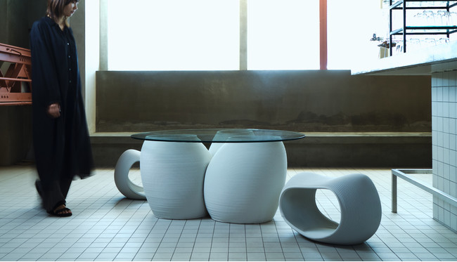 主に煙草の吸殻や使い捨てマスクなどを10-30%配合し、セメント使用量を削減したリサイクルコンクリート。排出CO2の削減のみならず、軽量化と独自のデザイン性を実現しています。