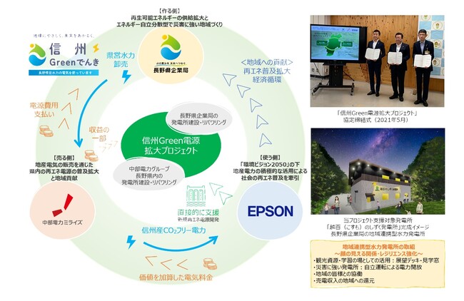 受賞した「信州Green電源拡大プロジェクト」は、水力発電の作り手(長野県企業局)と、発電電力の売り手(中部電力ミライズ)と、脱炭素化を積極的に推進する使い手(エプソン)の3者が協定を締結し、再エネ普及拡大と地域経済の活性化を目指す取り組みを推進するものです。