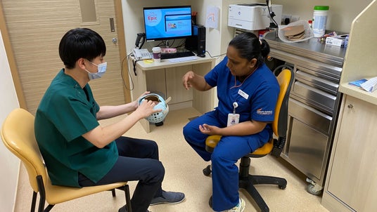 2025年6月、当社提携先医療機関である0歳からの頭のかたちクリニック福岡院長・梶田大樹医師がKKHを訪問し、PlagioCentreの外来を視察。現地スタッフに対して、日本国内での診療経験に基づいた意見交換および診療指導を実施しました。
