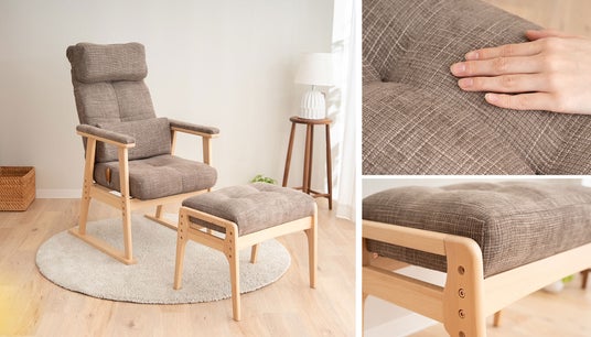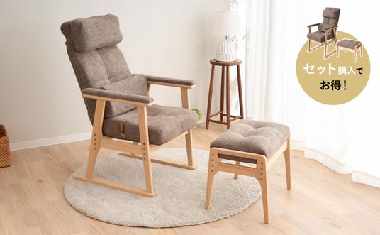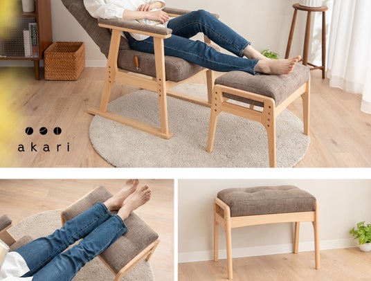 背もたれにこだわった高座椅子【akari】とオットマンスツールとの2点セットもご用意しました。