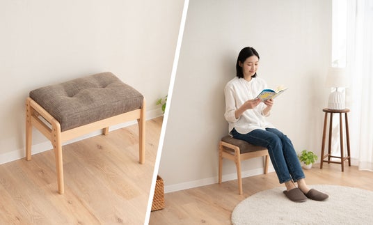 スツールの高さは高座椅子【akari】の座面高に合わせて設計しました。また、高座椅子と同じカラーなので、統一感のあるお部屋に。