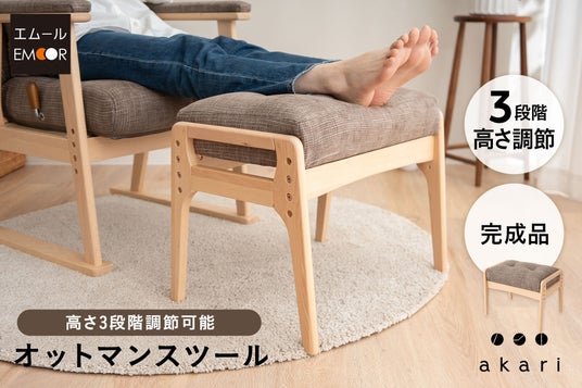 健康家具ブランドEMOORは、体験ショールーム来場者からのご要望にお応えし、背もたれにこだわった高機能高座椅子【akari】に合う専用オットマンスツールの販売を開始しました。