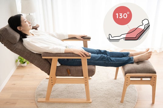 人間工学では、長時間座るのに楽な座り姿勢(安楽姿勢)は約120~130°といわれています。深くリクライニング(130°以上に)した場合は、重心が背もたれ側に寄り、足元がふわっと浮いてしまいがちです。