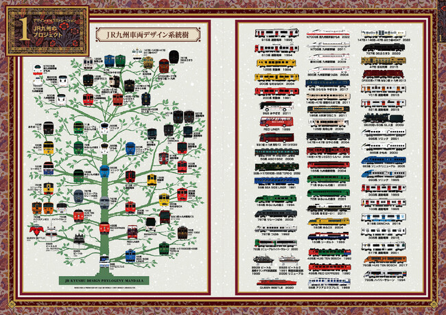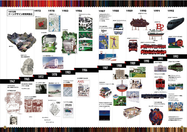 本書は6つの章を立て、カテゴリーごとに作品を掲載。冒頭にはイラスト入りの年表を入れ、水戸岡氏の仕事が時系列で把握できるようになっています。作品には「額縁」をつけてギャラリーを見て回るような趣向になっていますが、数を絞ってきれいに配置するのではなく、「図鑑」のコンセプトで可能な限り多くの図版を詰め込んでいます。細かな素材も合わせると画像点数は3000点近くに及びます。