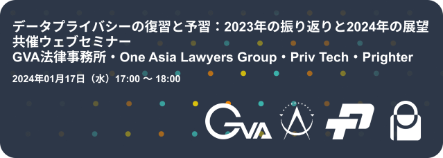 Priv Tech株式会社(本社:東京都港区、代表取締役:中道 大輔、以下Priv Tech)は、GVA法律事務所(本社:東京都渋谷区、代表:小名木俊太郎、山本 俊、以下GVA)、One Asia Lawyers Group(本社:東京都千代田区、代表弁護士:栗田 哲郎、以下One Asia Lawyers)、Prighter(EU本部:オーストリア・ウィーン、CEO:アンドレアス・メッツラー、以下Prighter)と共同で、無料オンラインセミナー『データプライバシーの復習と予習: 2023 年の振り返りと2024 年の展望』を2024年1月17日(水)17時より開催いたします。