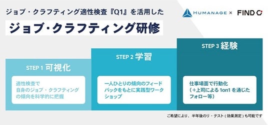 このたび、20年を超える適性検査の開発ノウハウを持つヒューマネージと、ビジネススキル・キャリア研修において豊富な実績をもつファインド・シーの提携により、ジョブ・クラフティング適性検査『Q1(Quest One)』を活用した「ジョブ・クラフティング」研修の提供を開始します。