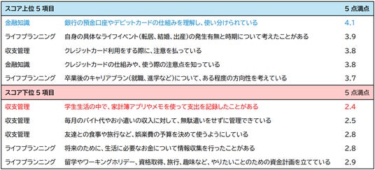 今回の受講者全体のFWB診断の設問ごとに、平均スコアが高いもの・低いものを5つずつピックアップしました。スコアが高かった設問としては「金融知識」「ライフプランニング」の分野のものが上がりました。スコアが低かった設問には「収支管理」「ライフプランニング」が上がり、スコアも最下位(2.4)と最上位(4.1)で倍近い開きがあります。