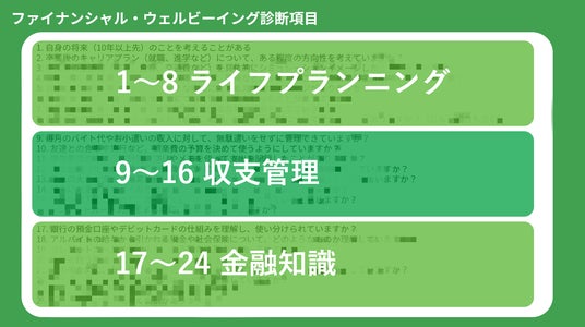 金融知識・収支管理・ライフプランニングの3つの分野についてそれぞれ8問ずつ質問が用意されており、各設問1~5点で自己採点(8問×5点=各分野40点満点)することで、お金に関する健康状態=ファイナンシャル・ウェルビーイング度をセルフチェックします。