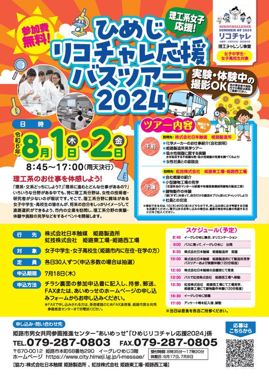 姫路市内の在住、在学の女子中学・高校生(応募者)が株式会社日本触媒姫路製造所、虹技株式会社姫路東工場・西工場を訪問します。実験や工場見学、女性社員等との交流会を行います。