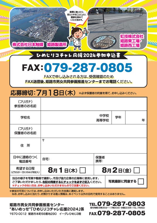 ファクスで申込みされる方は、受信確認のため、ファクス送信後、姫路市男女共同参画推進センター(079-287-0803)までお電話ください。