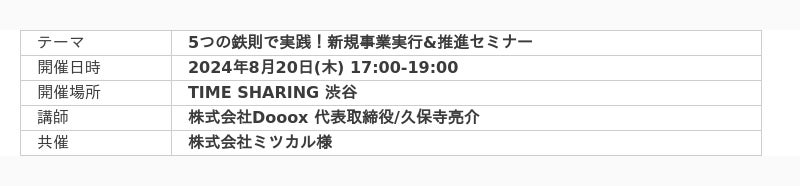 2024年8月20日に株式会社ミツカル様と士業の皆様に向け、「5つの鉄則で実践!新規事業実行&推進セミナー」を共催しました。