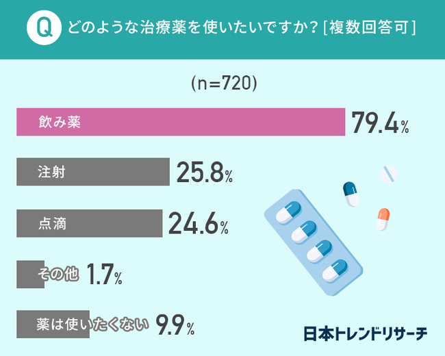 「注射」や「点滴」を選んだ方が25%ほどで、「薬は使いたくない」と回答した方も9.9%いました。