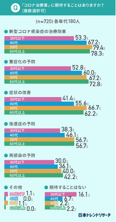 「コロナ治療薬」に期待することについては、「新型コロナ感染症への治療効果」「重症化の予防」といった即時的な効果に期待する方が6割を超えた一方、「期待することはない」と回答した方も6.8%いました。