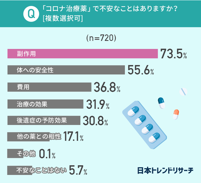 73.5%の方がコロナ治療薬で不安なこととして「副作用」を選びました。