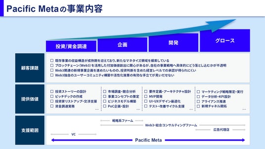 Pacific Metaは「Web3領域のアクセラレーター」として、国内外のWeb3プロジェクトを一気通貫で支援している会社です。