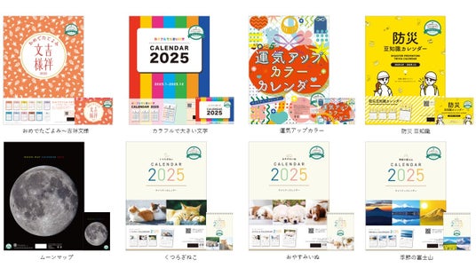 2025年版チャリティーカレンダーは、定番の『くつろぎねこ』や『吉祥文様』をはじめ、新ラインナップとして『ムーンマップ』や『運気アップカラー』など、バリエーション豊富なカレンダーが勢ぞろい。これらのカレンダーを通じて、使うたびに感じる満足感とともに、社会に貢献できる喜びも手に入れられるカレンダーです。