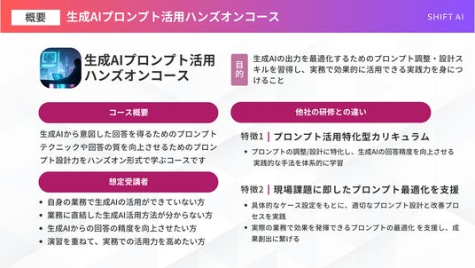 「日本をAI先進国に」を掲げAIのビジネス活用を学べるAI大学「SHIFT AI」を運営する株式会社SHIFT AI(東京都渋谷区、代表取締役 木内翔大、以下 当社 )は、DX(デジタルトランスフォーメーション)推進に必要な法人向け新サービス「生成AIプロンプト活用ハンズオンコース」を2025年4月18日より提供開始します。
