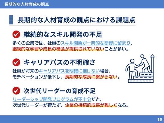 近年、次世代リーダーの育成や長期的な人材育成の重要性がますます認識されており、特に継続的なスキル開発や明確なキャリアパスの提供が企業の成功に直結しています。長期的な人材育成は、企業全体の持続的な成長を支える基盤となり、競争力の強化にも寄与します。