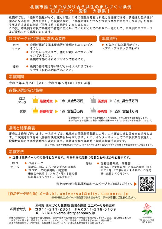 デザインの要件や詳しい応募方法などは、札幌市公式ホームページに掲載している募集要項をご確認ください。ホームページ:https://www.city.sapporo.jp/kikaku/universal/jourei/logo_aisyou.html