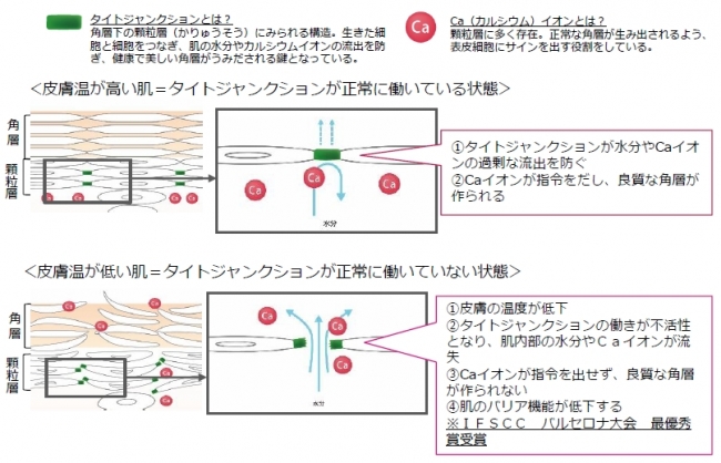 2.〔バリア機能低下〕皮膚の温度が低下すると、健康な角層を生み出す鍵「タイトジャンクション」の働きが不活性となり、肌のバリア機能が低下!