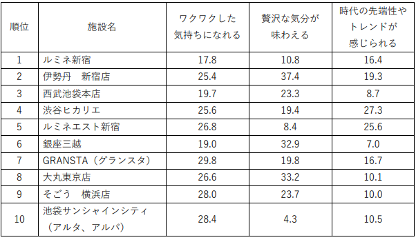 TOP10にランクインした施設の印象を利用者に聞いたところ、百貨店は共通して「贅沢な気分が味わえる」が高スコアでした。今、百貨店に何が求められているか、お客様のニーズを捉え、どのような価値を提供できるかが復活の鍵になりそうです。