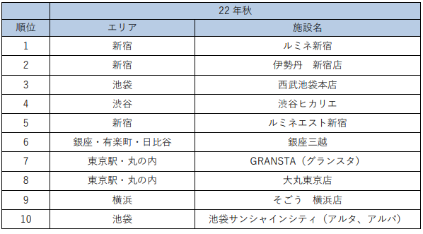 また、TOP10には、SCと百貨店が5施設ずつランクインしました。都内の百貨店は10月初めに小田急百貨店新宿店の本館が閉館したほか、2023年1月末には東急百貨店本店が閉店するなど建て替えや再開発が多く予定され、顧客のつなぎとめやビジネスモデルの見直しが課題となっています。