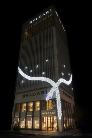 イタリアが誇る、世界的なハイジュエラーBVLGARIのブルガリ 銀座タワーにこの季節限定「セルペンティ(Serpenti)」(イタリア語で“ヘビ”の意)のイルミネーションが登場しました。