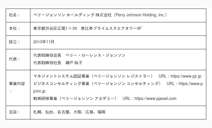 1994年に設立されたマネジメントシステムの第三者認証機関Perry Johnson Registrars, Inc.(本社:米国ミシガン州)の日本法人として、ISO 9001(品質)、ISO 14001(環境)、ISO/IEC 27001(情報セキュリティ)、ISO 22000(食品安全)、FSSC 22000(食品安全)、ISO 45001(労働安全衛生)などを認証審査しています。