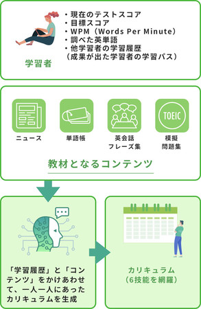 あなたの「英語レベル」「興味のある分野」「ライフスタイル(使える学習時間)」を主軸として、完全にカスタマイズされた学習カリキュラムを毎朝7時に生成します。累計190万人以上の学習実績データ分析とAI人口知能で、一人一人に最適化された学習を提供が可能となります。MyRecipe通常版とTOEIC(R)️L&R版の切替が可能です。TOEIC(R)️L&R版では、下記コンテンツを活用してスコアアップが実現可能です。