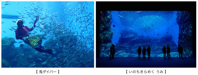 幅14m、水深7.5mの大水槽「いのちきらめく うみ」に、鬼に扮したダイバーが登場します。大水槽に現れて暴れている鬼を退治するため、約2万尾のマイワシたちが大きな群れとなり、立ち向かいます。古くからマイワシは鬼の魔除けとして使われており、大水槽の平和のために大活躍なマイワシたちの様子をお楽しみいただけます。