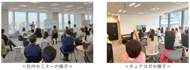グループ会社の株式会社ベネクスと共同で、休憩時間を活用して顔ヨガ、チェアヨガを行うなど社員の健康増進に繋がる取り組みを実施しています。健康のための3大要素「運動」「栄養」「休養」の中でも、ベネクスが推奨するパフォーマンスを向上させるために必要な「休養」についての理解を深め、社員一人ひとりのウェルビーイング向上を推進しています。