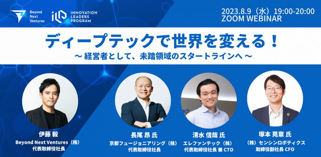 Beyond Next Ventures株式会社(本社:東京都中央区、代表取締役:伊藤毅、以下「当社」)が運営する経営者を目指すビジネスパーソンを対象にしたディープテック創業実践プログラム「INNOVATION LEADERS PROGRAM」(ILP)14期の募集を9月1日(火)まで実施いたします。