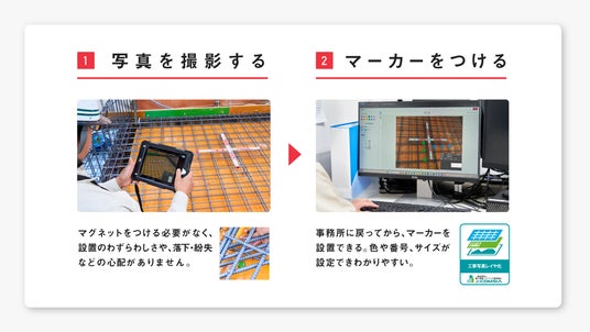 「配筋マーカー」は、撮影済みの鉄筋写真に電子マーカーを付与し、それらの写真を用いて台帳を作成したり、写真のダウンロードができる機能です。
